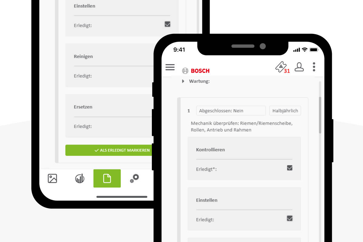 Das Wartungsprotokoll kann direkt am Handy ausgefüllt werden, während die Wartung durchgeführt wird. Erledigen Sie Maßnahmen durch ein einfaches Folgen von Anweisungen und Abhaken von Wartungsschritten.