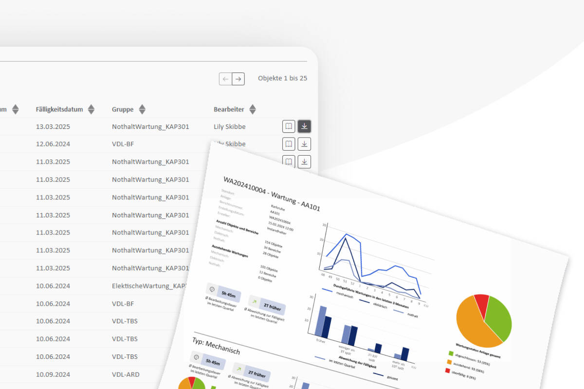 Gewährleistung maximaler Verfügbarkeit durch automatisch generierte Wartungsberichte, welche die Arbeit Ihres Instandhaltungsteams erleichtern. Vermeidung von Dokumentationsfehlern.