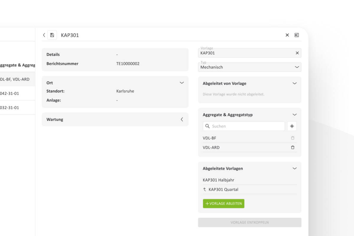 Editor für Wartungsvorlagen, automatische Berichte und Know-How-Transfer, Bilder und Kommentare ergänzen möglich.